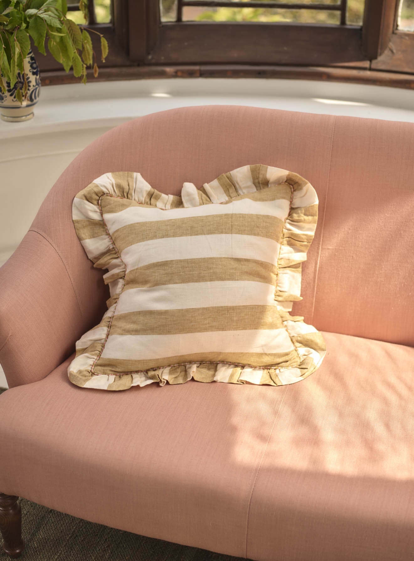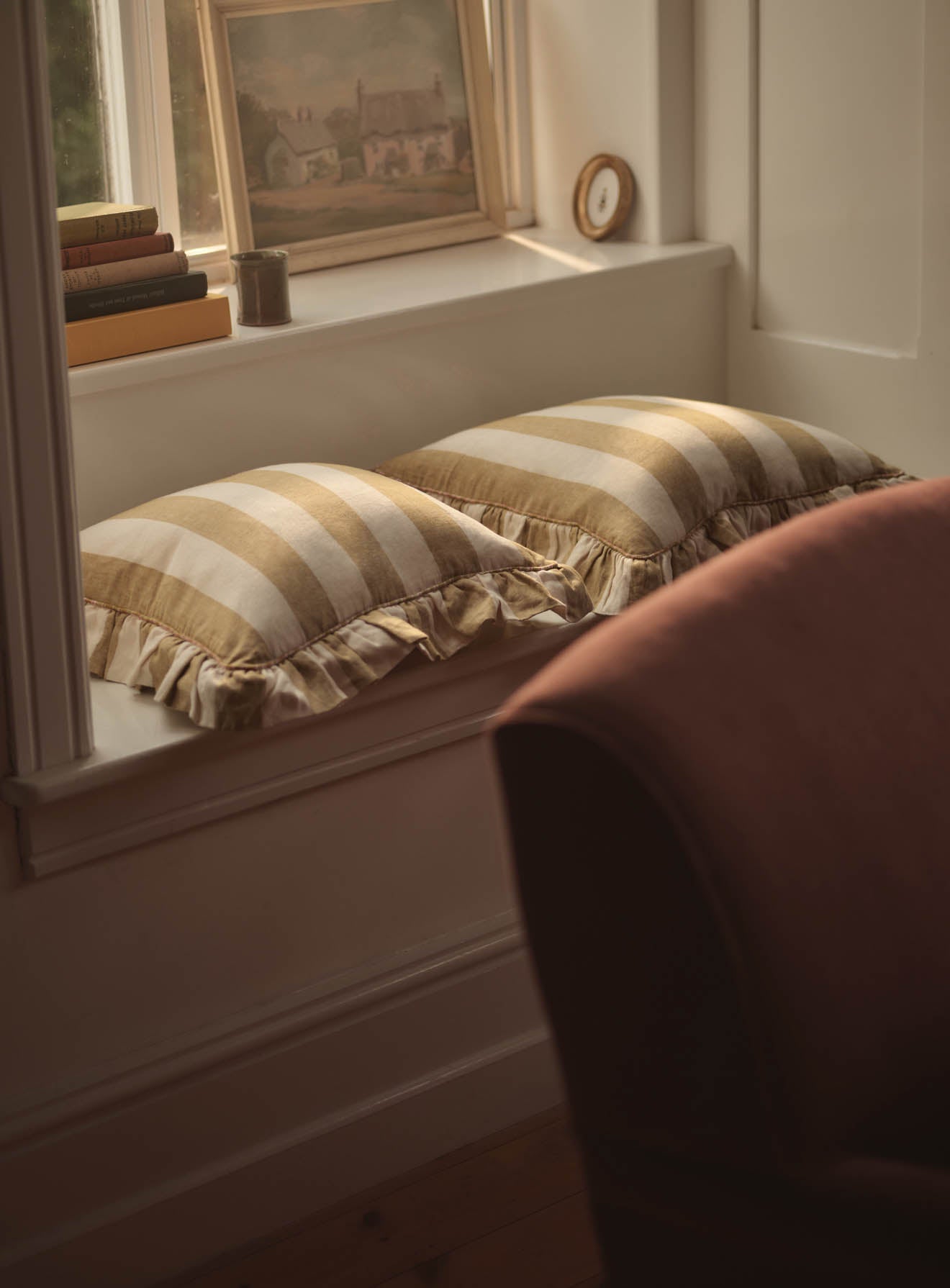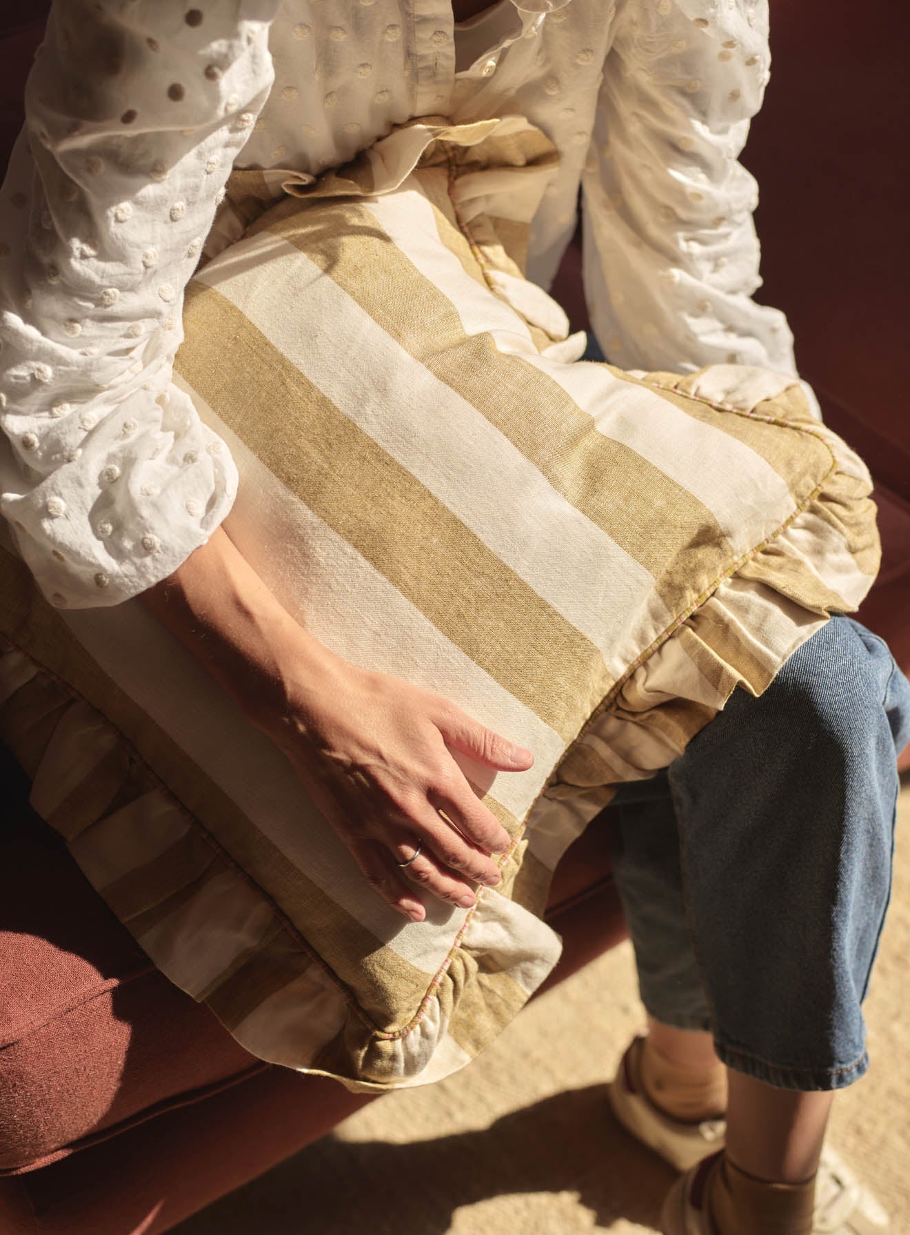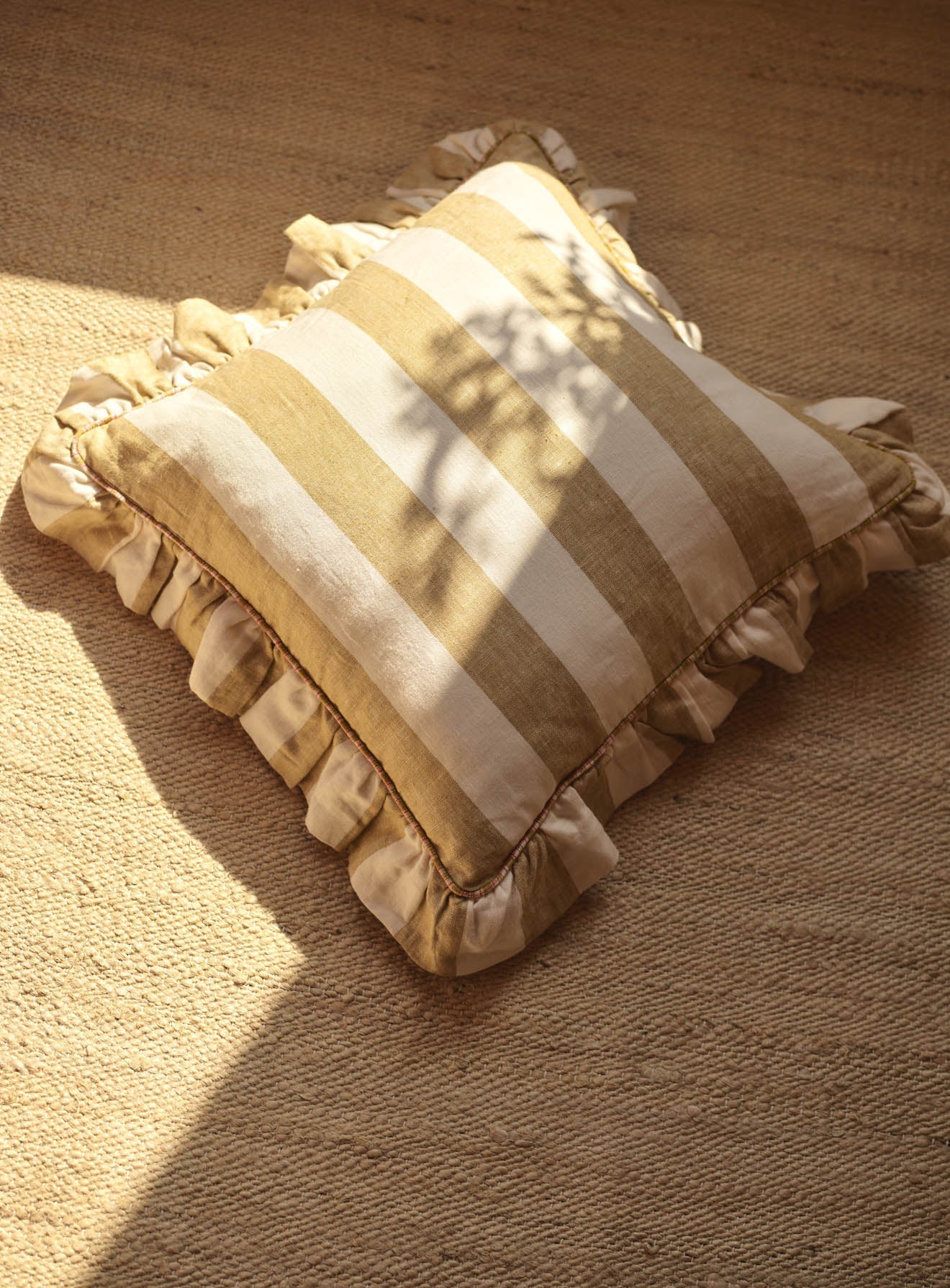 - A frilled stripe cushion in warm, cheerful yellow tones