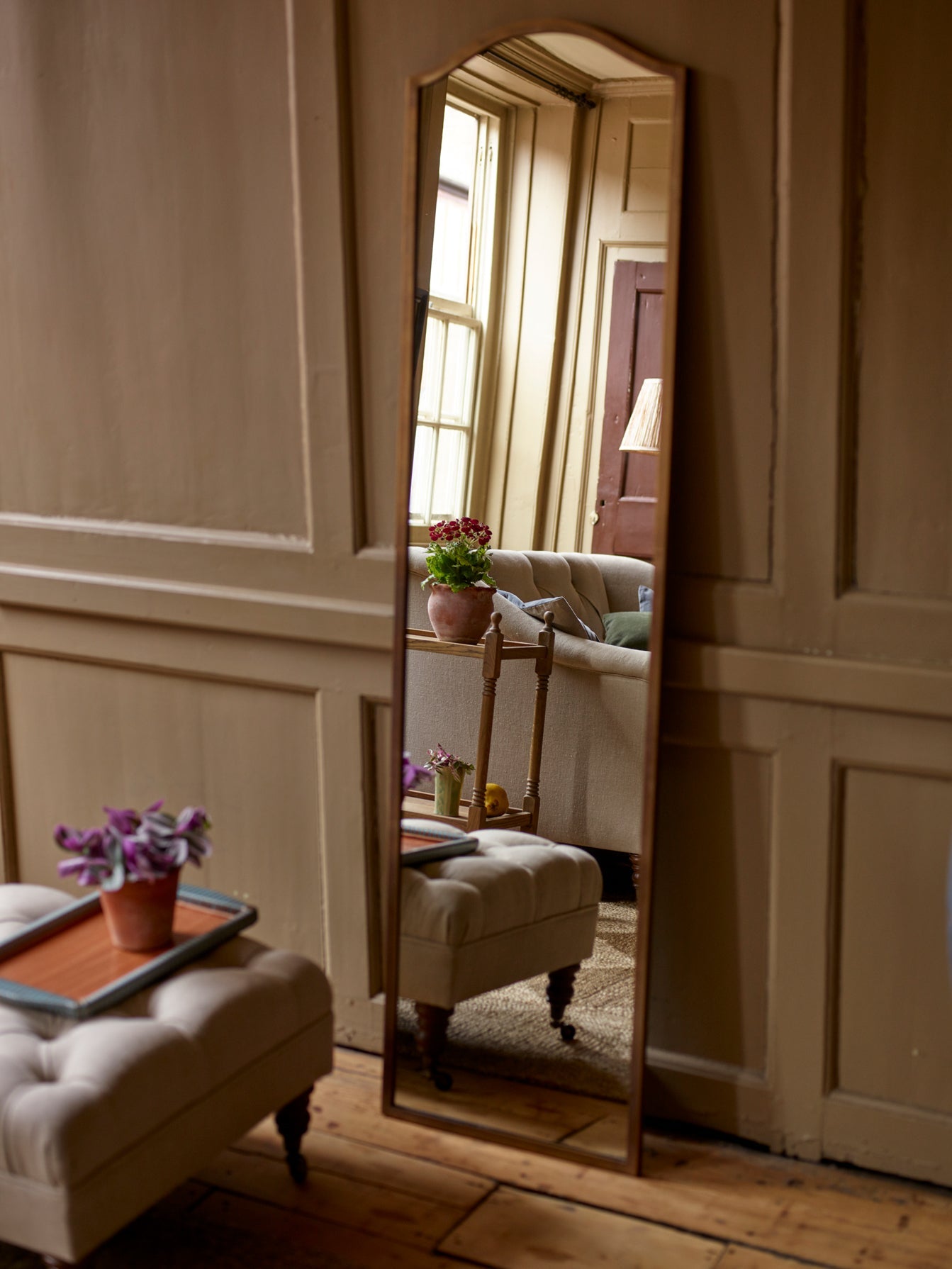 - A full-length brass-framed mirror with a curvaceous top