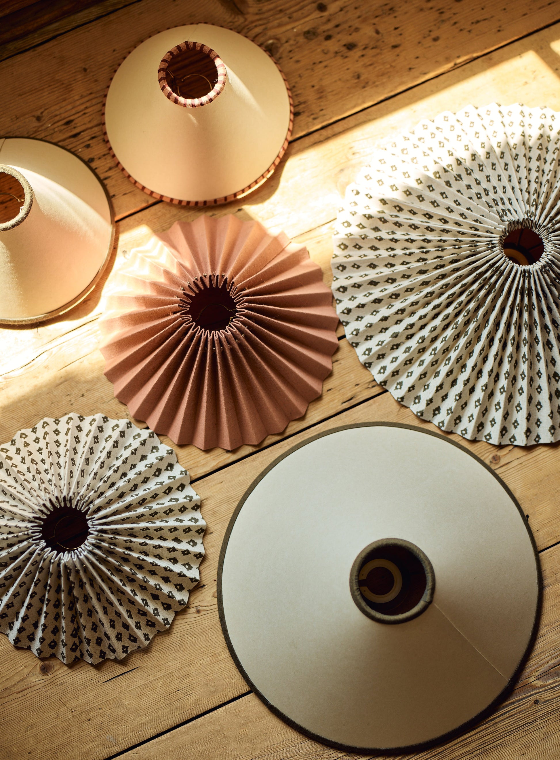 - A petite pleated lampshade in a vintage-inspired screen-printed cotton