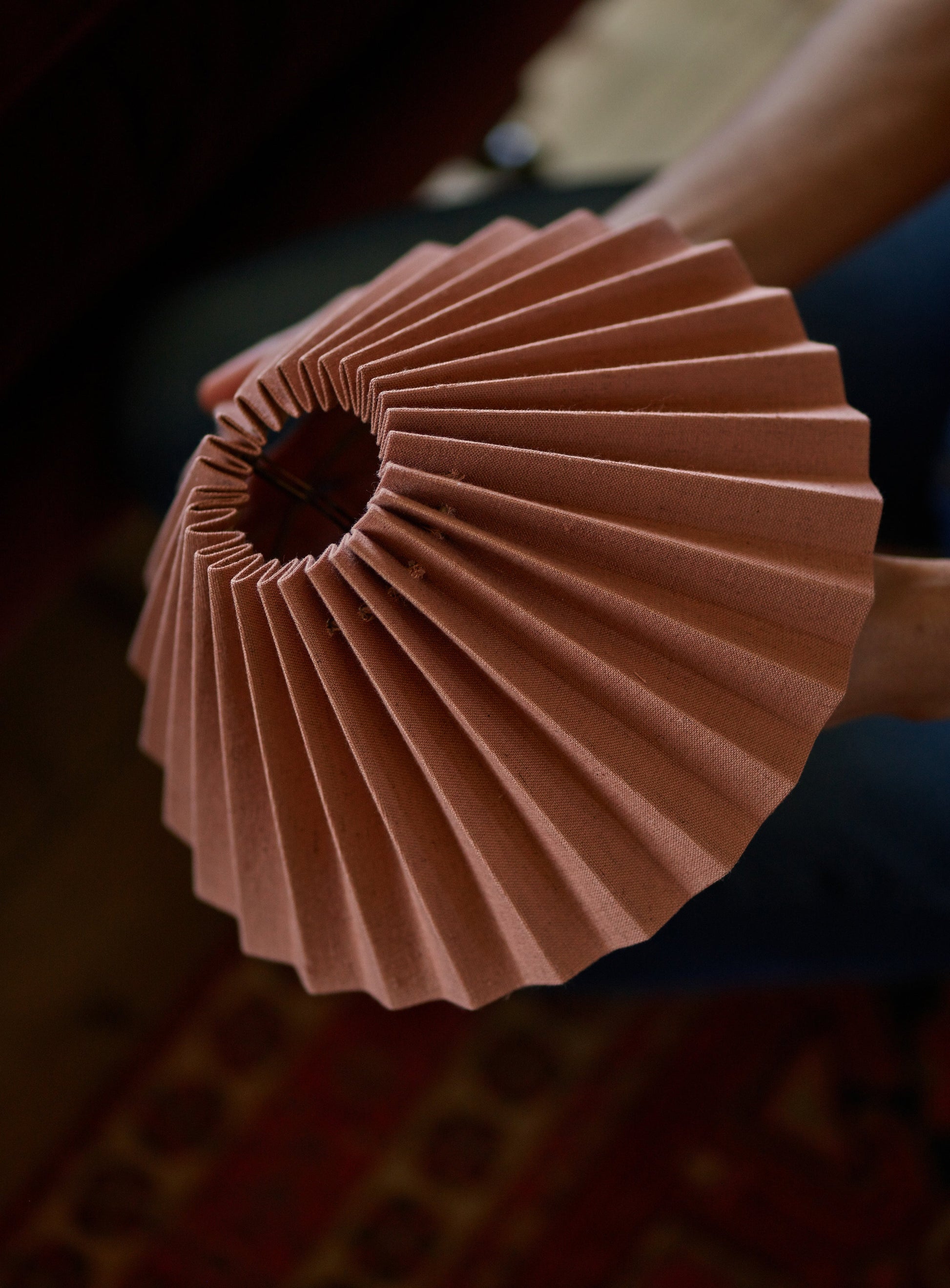 - A petite pleated lampshade in bespoke plaster pink